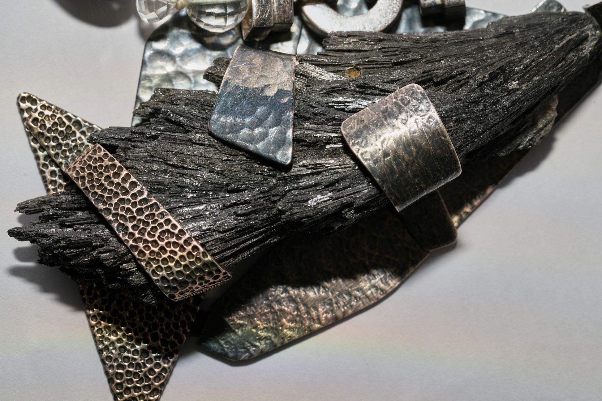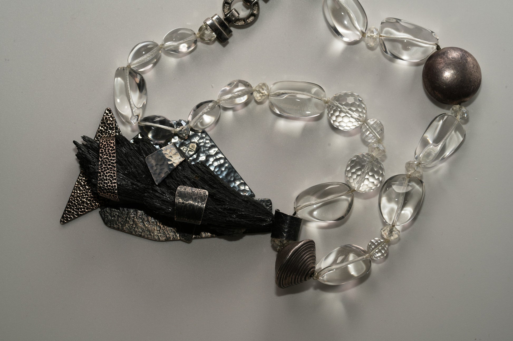 Handmade in Mexico by Guillermo Arregui, black kyanite and sterling silver pendant is paired with assorted quartz and sterling silver beads to make a dramatic necklace. The pendant is appx 3 1/2" in length or appx 90mm and appx 2" or appx 51mm at the widest point. The quartz necklace which has faceted, smooth and nugget shaped quartz adds to drama of the pendant. Easy to wear with black or neutrals. Necklace measures appx 18" in length or 457mm plus the pendant. One of kind. Clasp is sterling silver, and can open from right or left. Pendant can be purchased separately inquire if interested. Additional stone might be added. New.