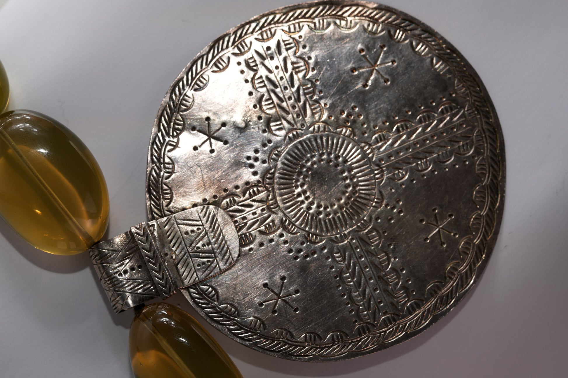 Large beautiful clear citrine smooth nuggets. Hand knotted and sterling silver hook clasp with fancy large sterling disc from Thailand. Sterling disc is appx 3 1/2" or 88.9mm in diameter and the nuggets are each appx 1 1/4" to 1 1/2" or appx 32mm to 38mm. Total length of citrines are appx 17" or appx 432mm. Disc adds another appx 4 1/2" or 114mm. The nuggets are very clear of any defect and look wonderful on. This necklace shows the sterling pendant, the citrines can be worn without the pendant and necklace could be re strung depending on your taste. New . Note the natural tone of the mannequin adds to the color of the citrines.