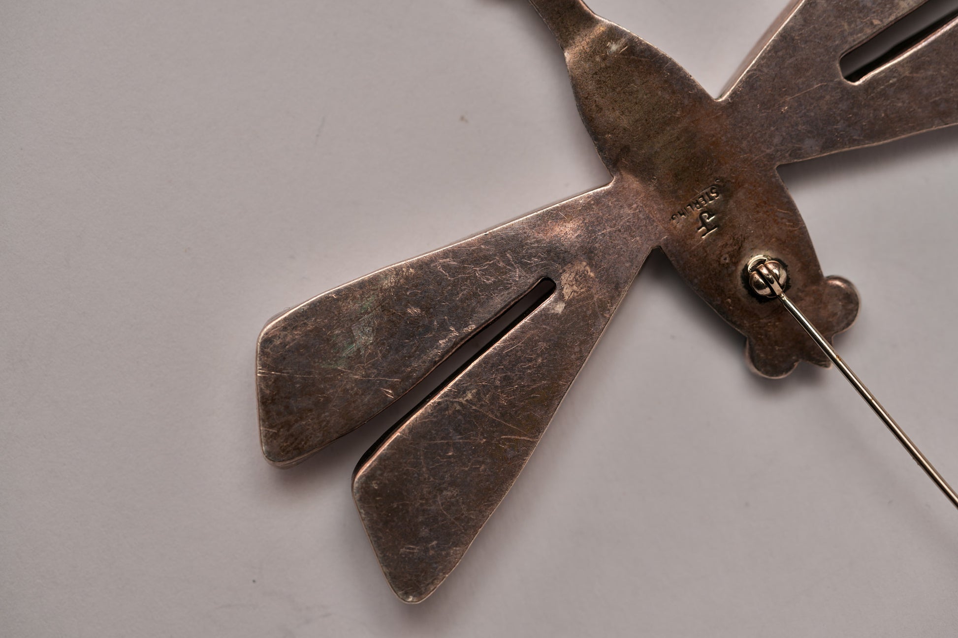 Vintage, wonderful large dragon fly pin by Federico Jimenez, Mexican. Wings are alabone shell and the body is turquoise stones and coral near the tail. Sterling silver. Hallmark JF for Federico. The pin is appx 3 3/4" in width or appx 85mm and the length of the pin is 3 3/4" or appx 85mm. Just stunning on dress or jacket. Very vintage. Pre owned in good condition.