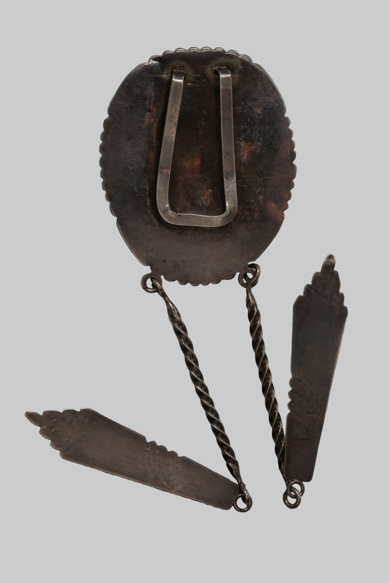 Drop in bolo meaning there is no tie, just a big clip that one uses at the top of your shirt that holds the bolo in place. Vintage for sure. Interesting concept for when you wear your shirt completely buttoned up at the neck. The actual bolo is a shadow box and that part is appx 2 1/2" or appx 64mm in width and the length is appx 3.25" or appx 83".The natural turquoise stone is appx 1 1/2" or appx 38mm in length. And the width is appx 1" or appx 25mm at the widest point. The bolo has 2 sterling long arrows so to speak that each have a turquoise stone.The long arrows are appx 6 1/2" or appx 165mm and the widest part of the long arrow which holds the turquoise stone is appx 3/4" or appx 19mm.The 2 turquoise stones cabs appx 1/2". Vintage and pre owned. Good condition.