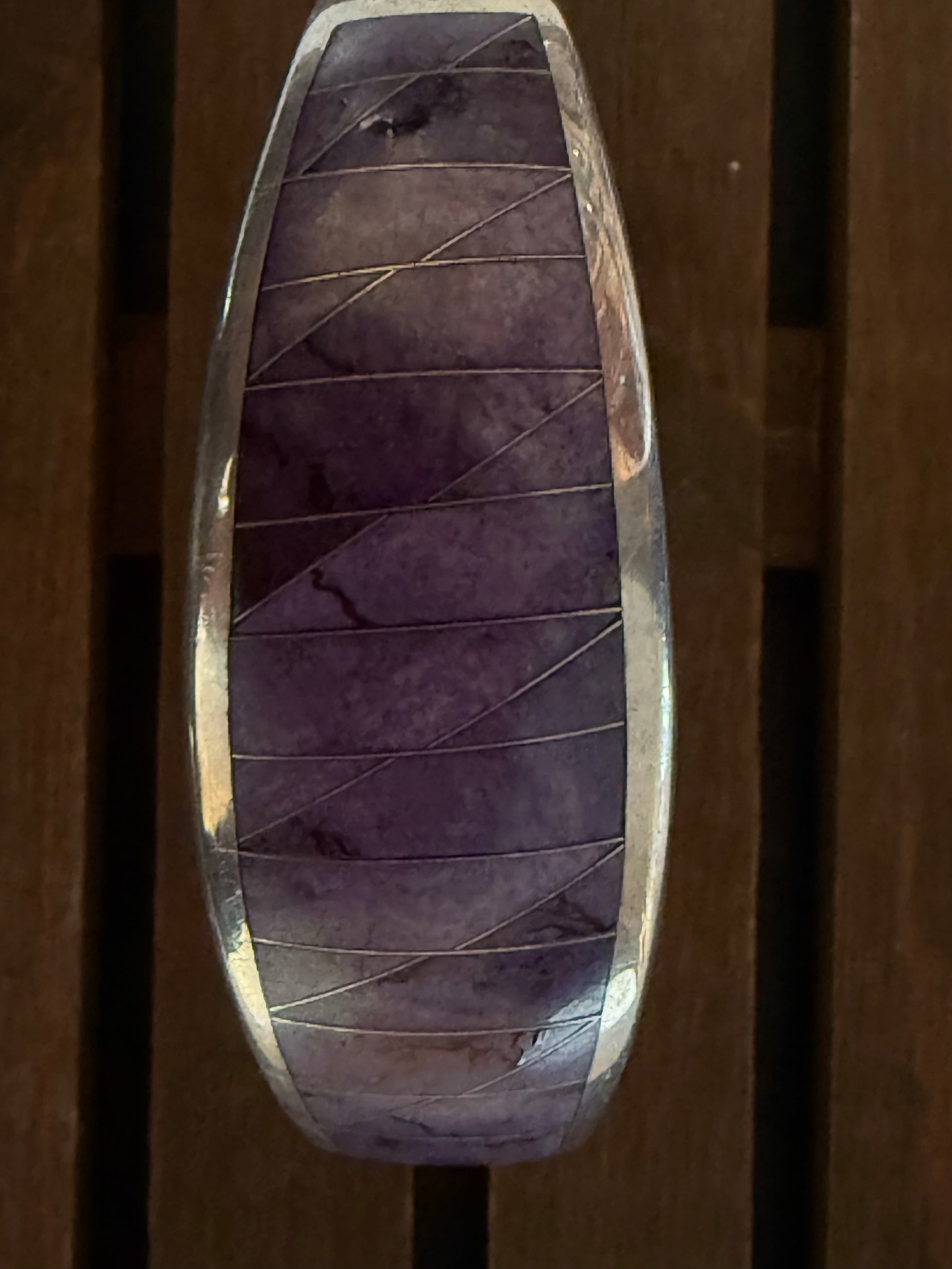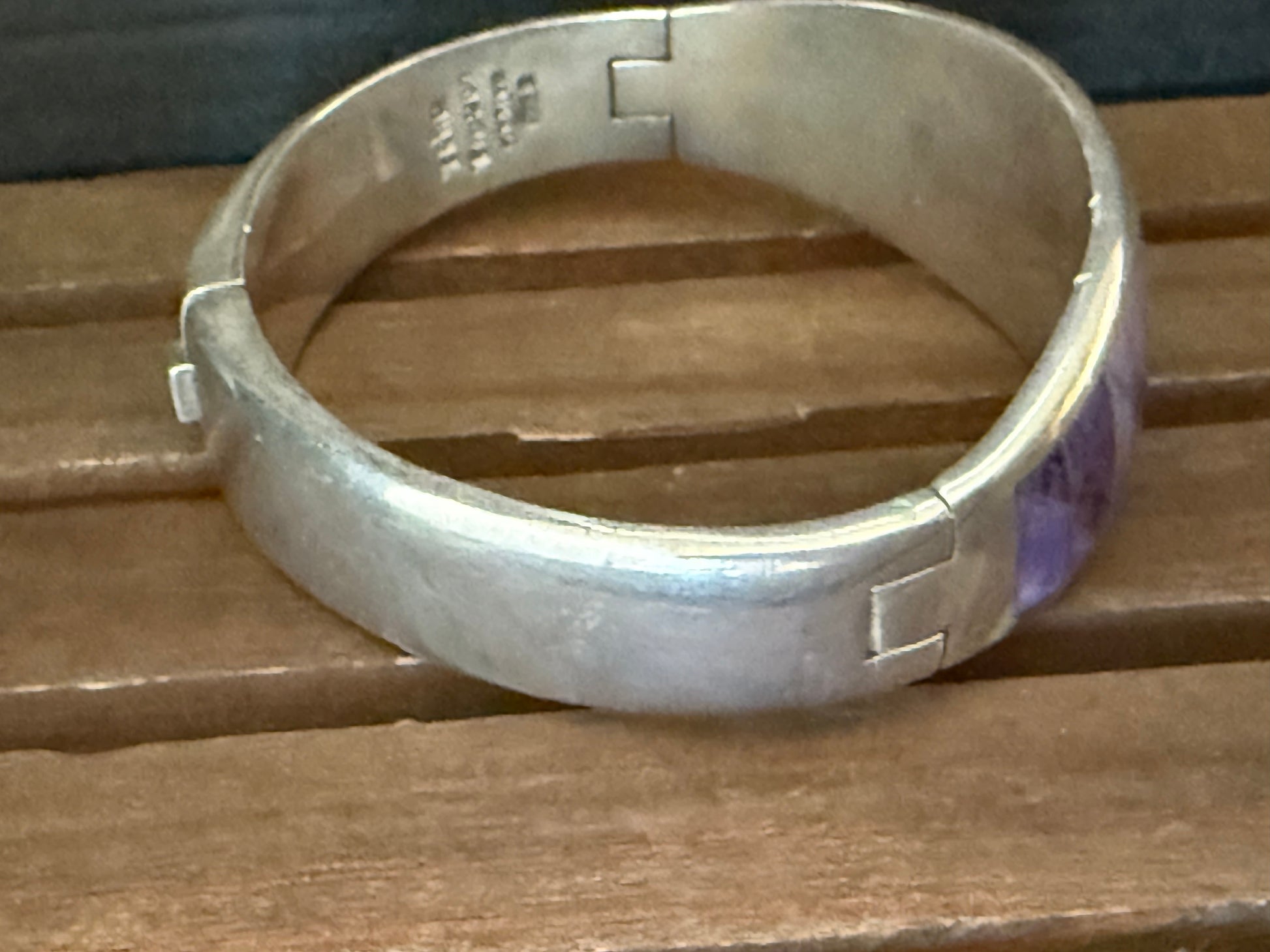 Sugilite and sterling silver and the components of this made in Mexico heavy, 74grams, appx bracelet with hinges and a clasp.