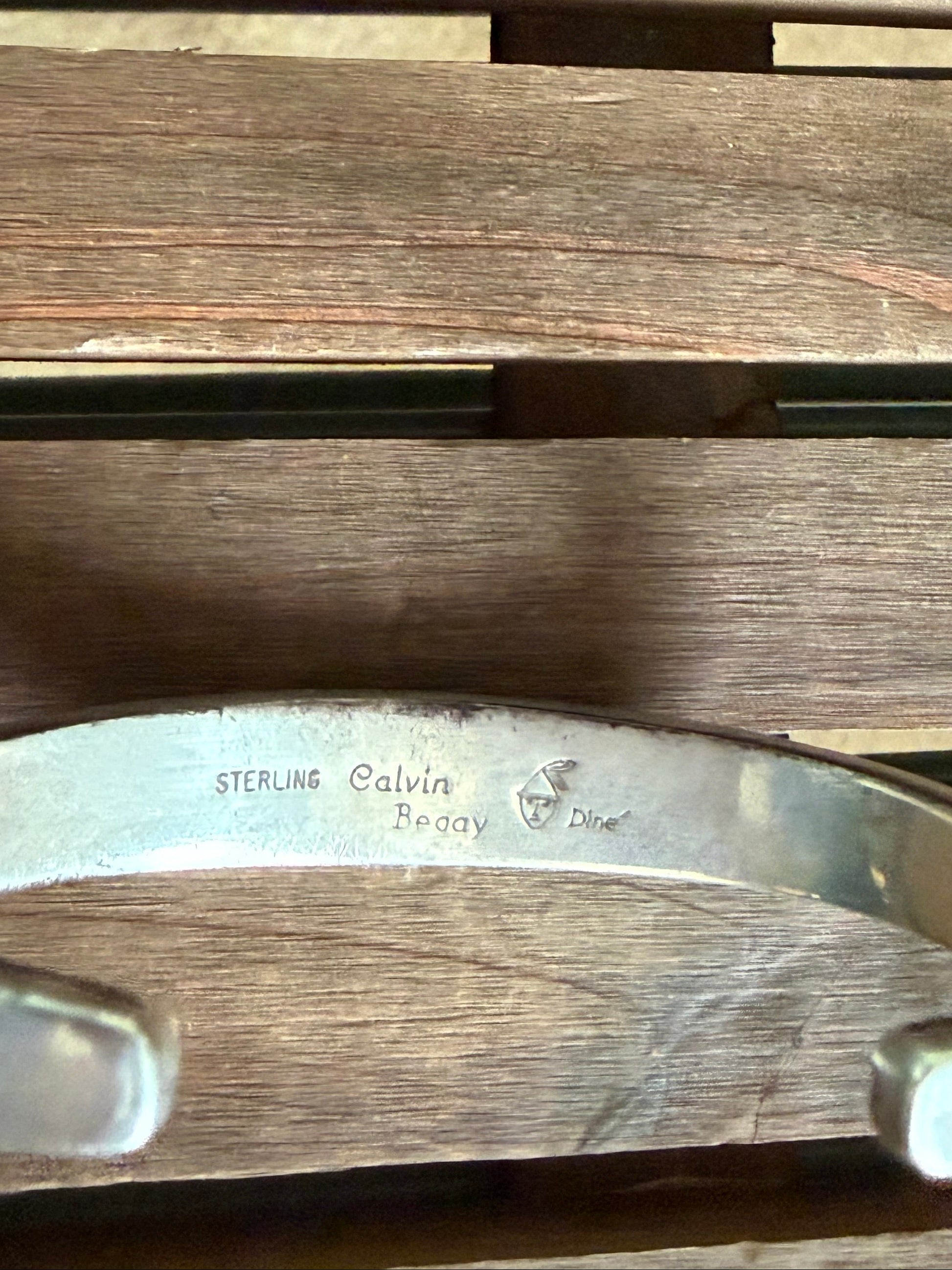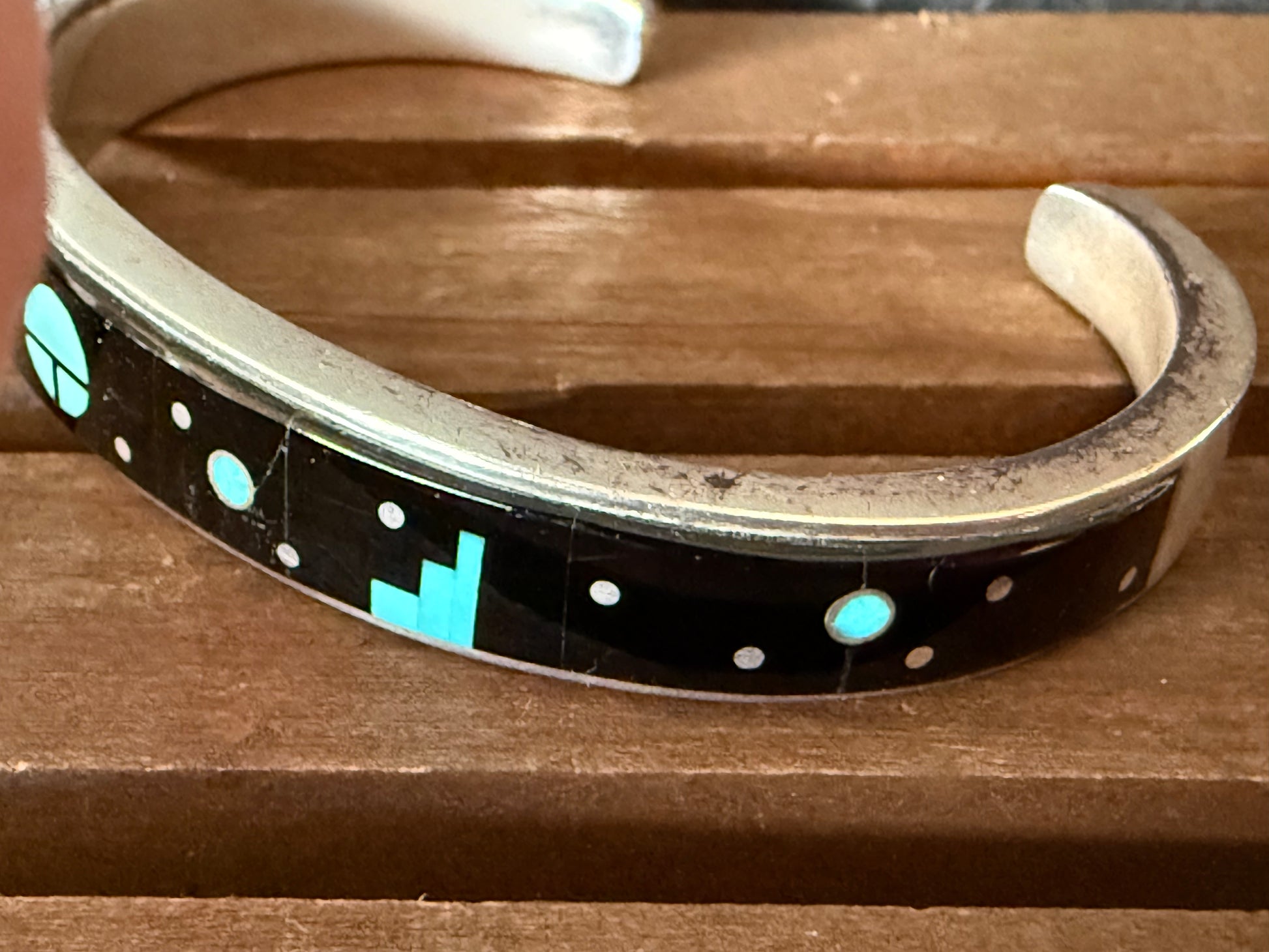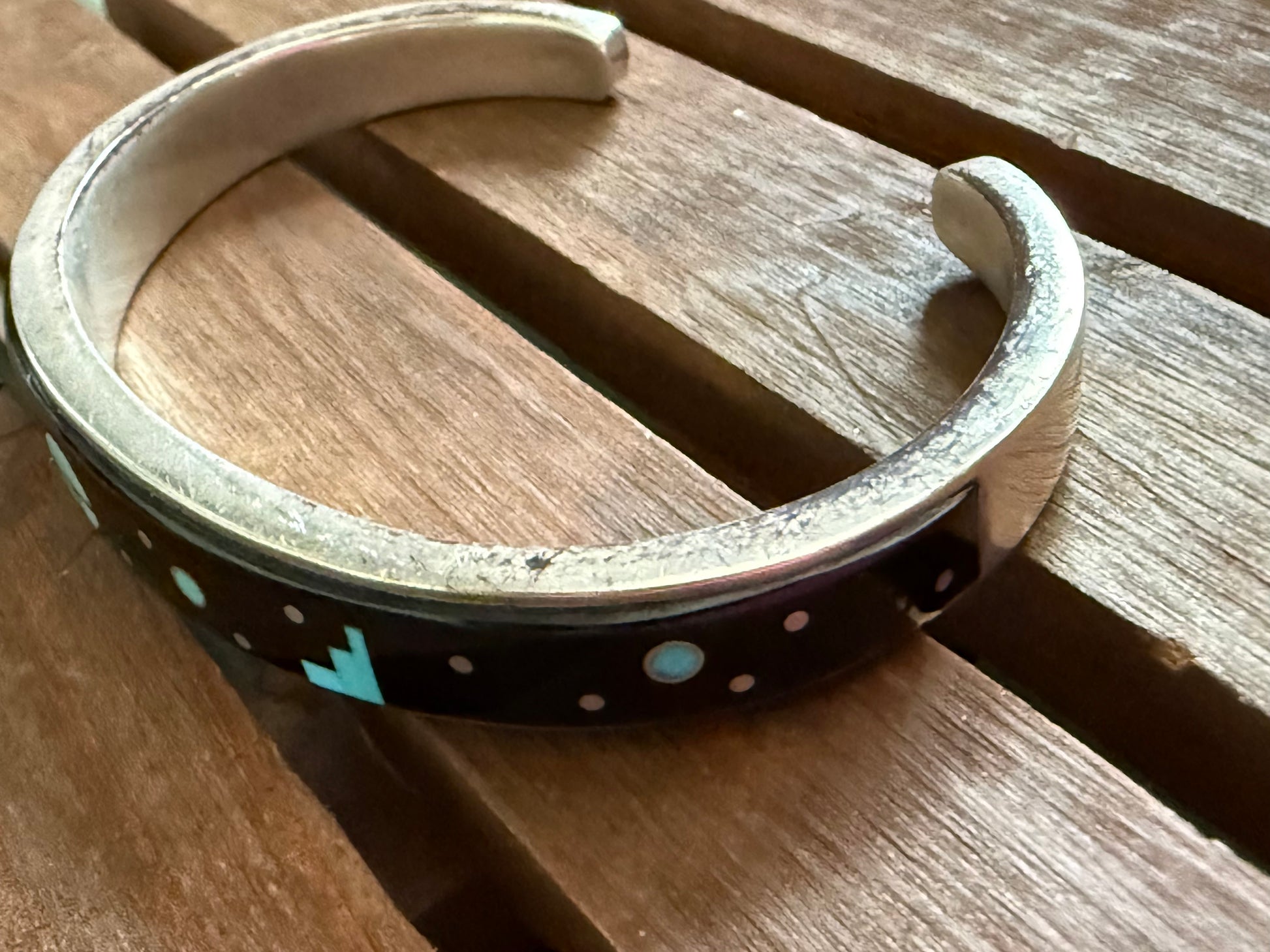 Calvin Begay, Navajo, known for modern mosaic and channel inlay made this sweet bracelet, not too big, not too heavy.
