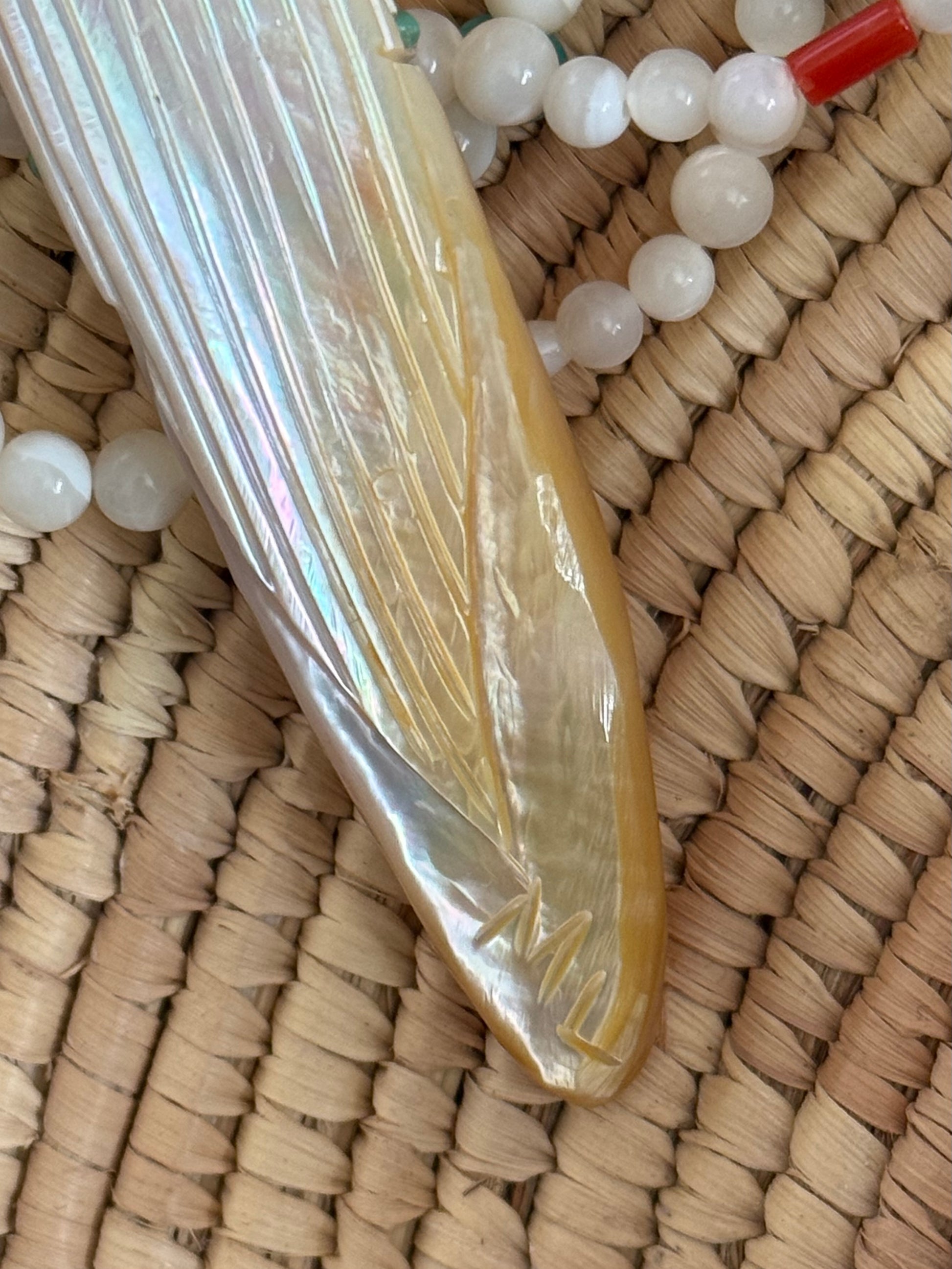 Wonderful large piece of mother of pearl with yellow lip carved as corn maiden with accents of turquoise coral and mother of pearl beads with coral and turquoise. Corn maiden is appx 3 1/2" long or appx 89m by 1 1/4" wide or 32mm at the crown. Body is appx 3/4" wide or appx 19mm. The 3 strands of mother pearl are appx 29" or 737mm. Carved by ML, believed Michael Laweka. Pre owned. great condition. Beautiful corn maiden.
