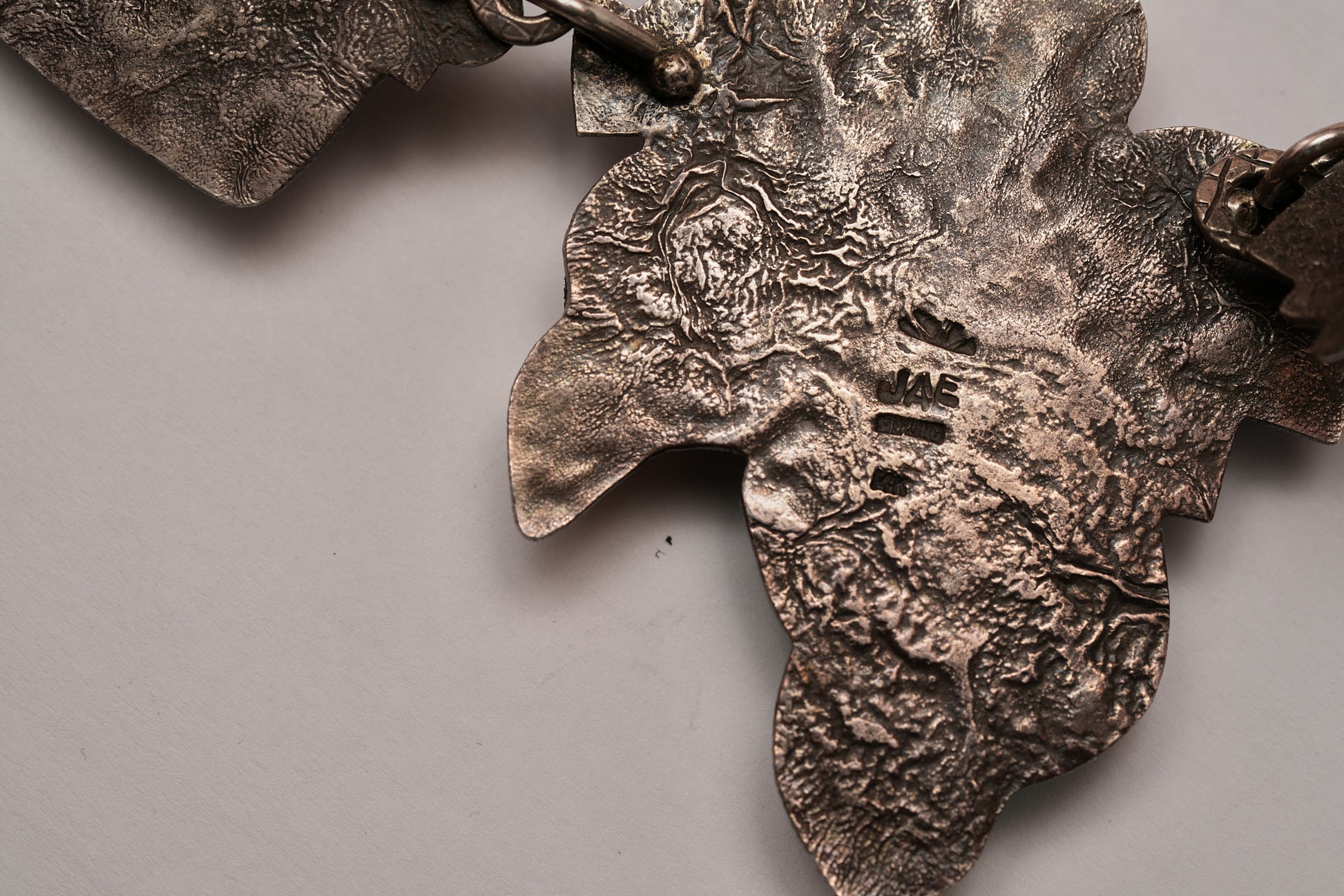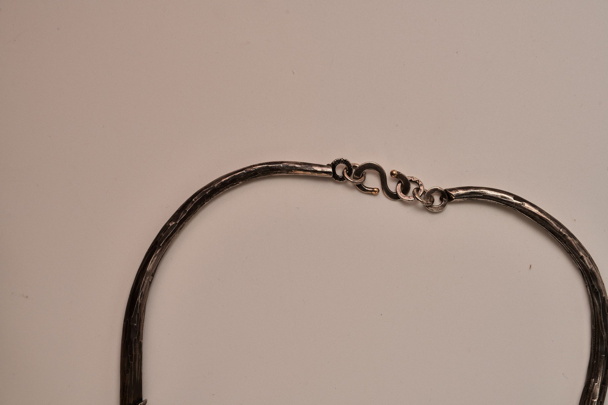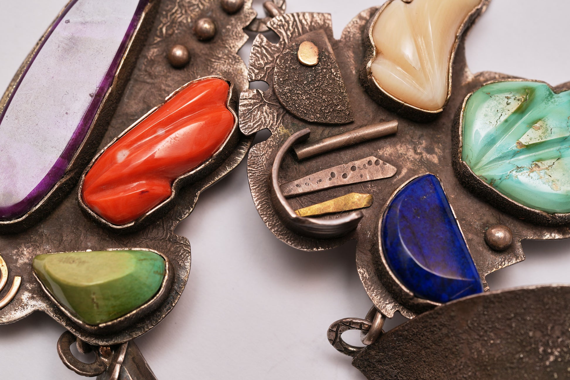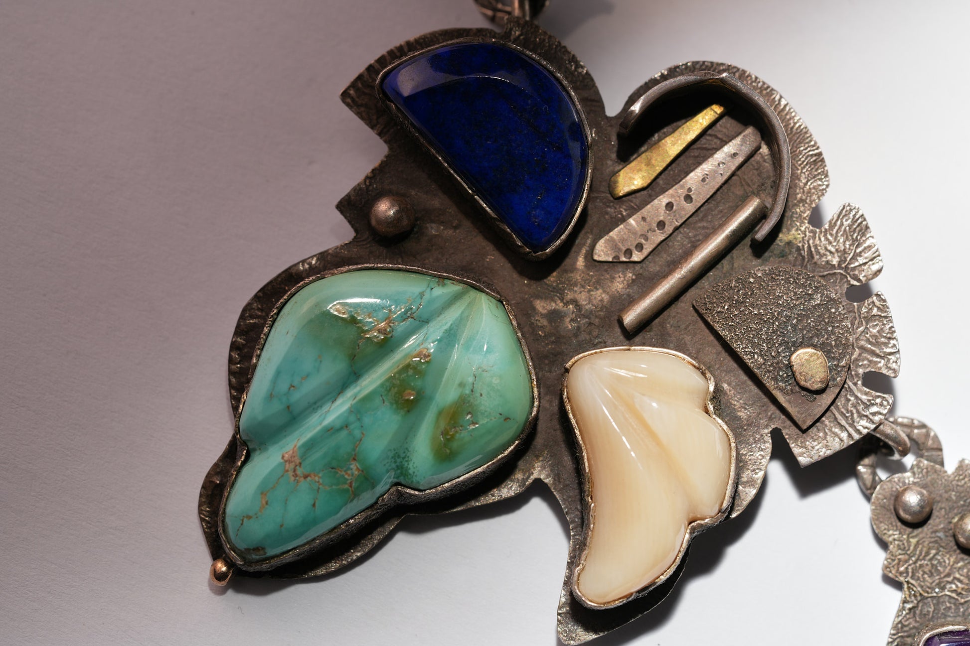 Jolene Eustace, Cochiti, creator of just great carved stones and sterling silver mountings. So creative, I believe she studied in Germany for awhile. Here's her necklace of sterling silver, 14kt gold, and the following carved stones: turquoise, lapis, mother of pearl, Japanese coral, sugilite ( I believe). Modern design and thoughtful. A real treat. Basically a size 16" around the neck or 406mm, the centerpiece is appx 2 1/2" or 64mm in width and the length is appx 2 1/2" or appx 64mm. The other side piece is 2 1/2" in length or appx 64mm and then the width . Pre owned and in very good condition.