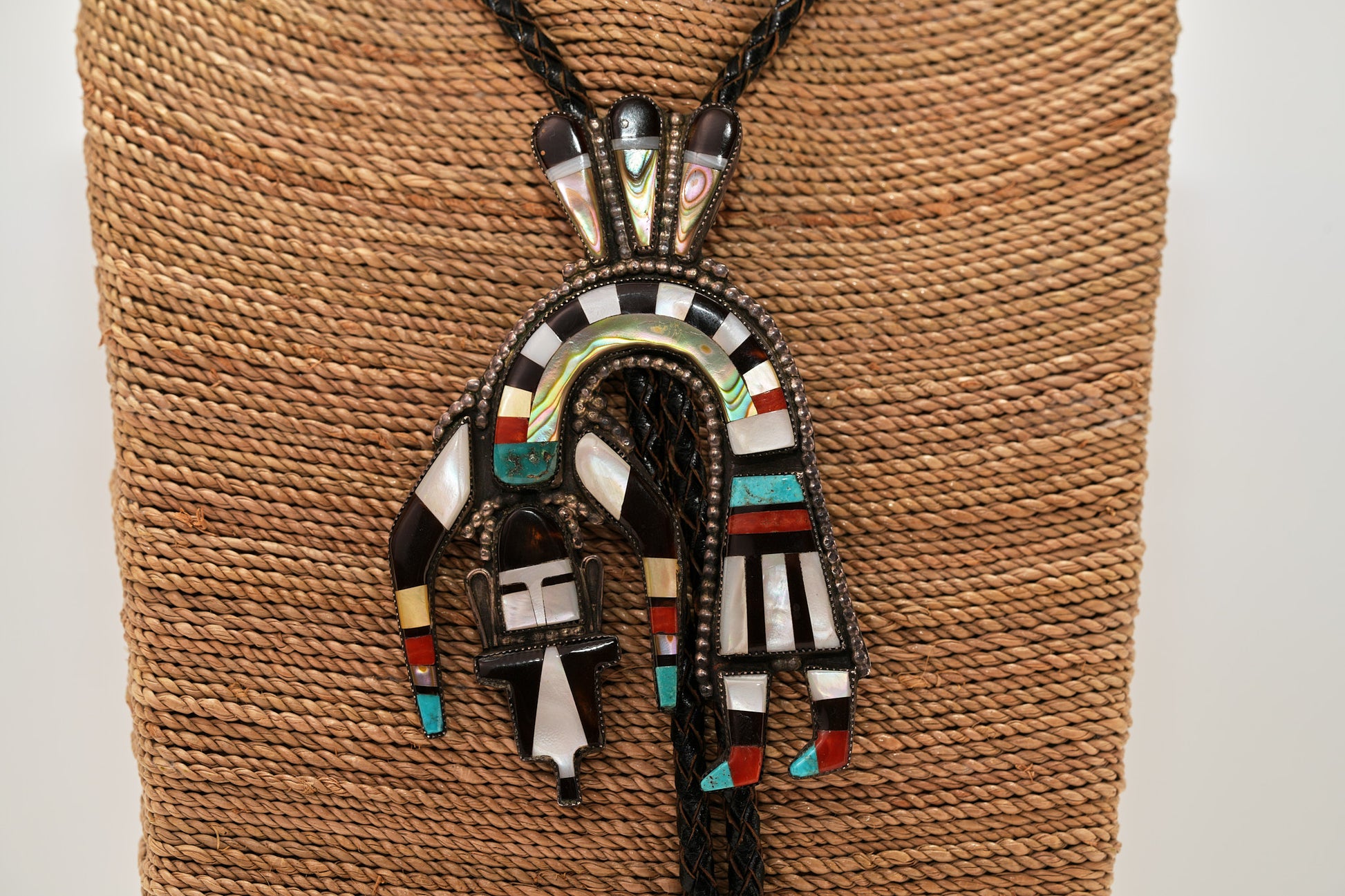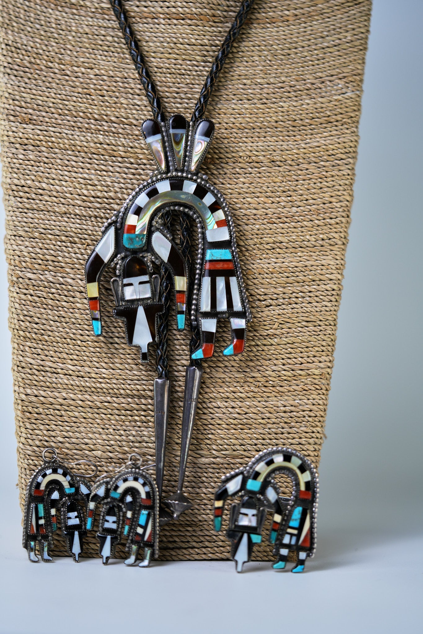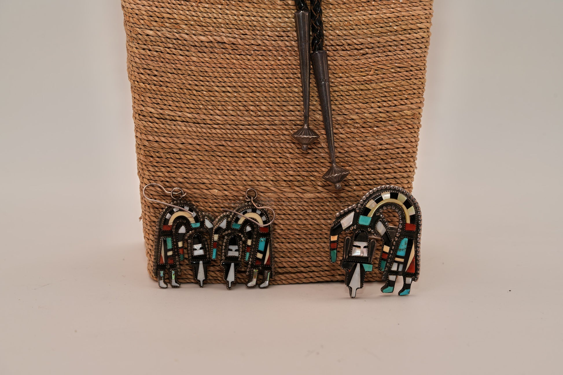 Angela and Oliver Cellicion, Zuni. In Zuni culture, the rainbow is strongly associated with the Rainbow Man (or Rainbow Dancer), a sacred guardian spirit who embodies the life-giving summer rains and the colors of the rainbow. He is a symbol of protection and is often depicted on Zuni war shields. The rainbow also represents the life-sustaining rains crucial for their agricultural practices. This is a set of a ring, pair of earrings, pierced and the bolo. The bolo measurment is appx 3 1/2" or appx 83mm in length by appx 2 1/4" or appx 57mm wide. Sterling silver back. The leather tie is 36" or 914mm and the silver tips are appx 2" or 51mm included in the measurement.The earrings are appx 1 1/2" long or appx 38mm by appx 1" wide or appx 25mm. Sterling silver mounting. The ring is appx 1 7/8" in length or appx 45mm and can be worn as a scarf holder or a ring. Appx Size 8-9. Sold as is missing one or two small black stones. Sterling silver back. Hallmark on the earrings hard to see. Pre Owned vintage set. As is.