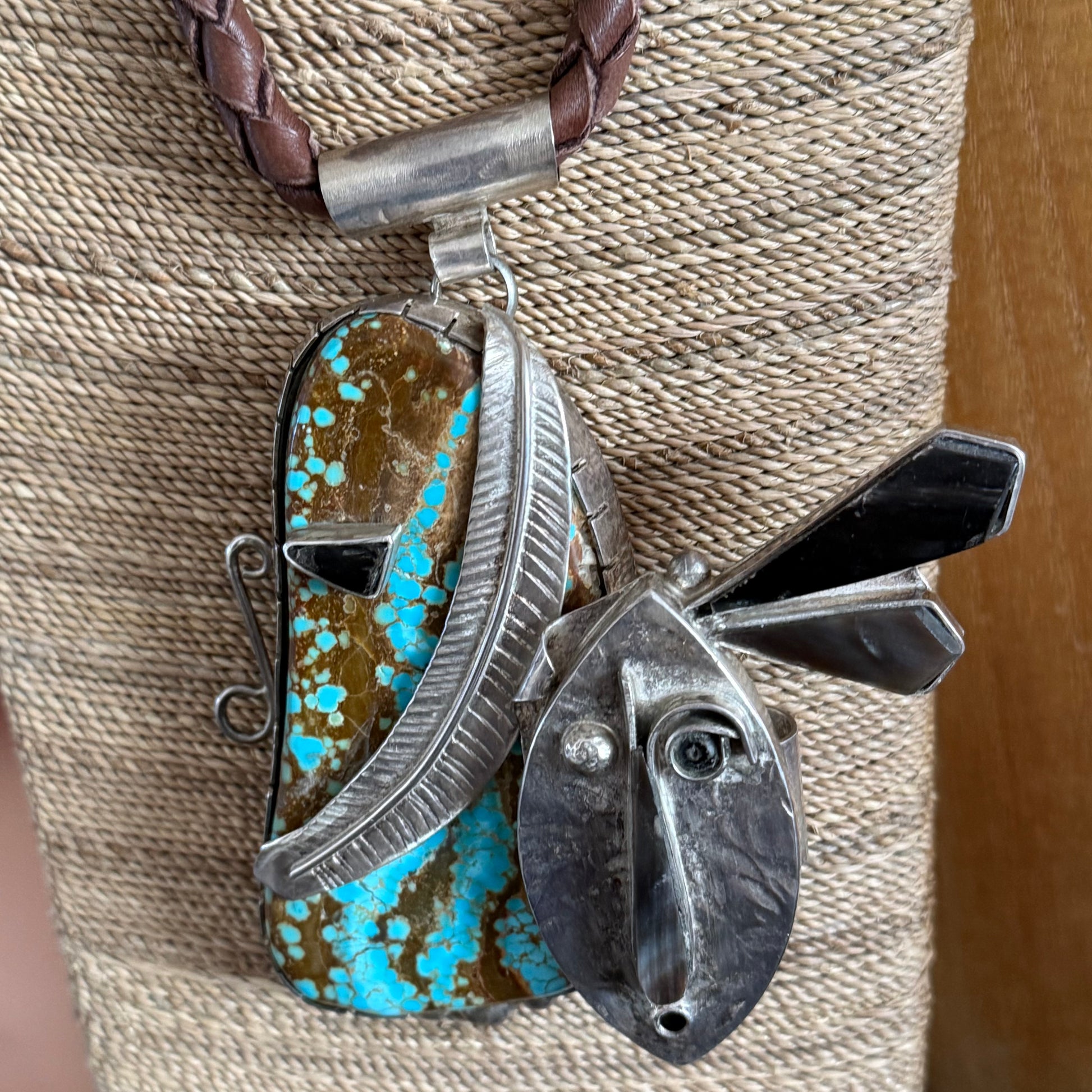 Buddy Lee cut the stone, created the sterling silver mounting and then used his creative ability to forge the face. The horn is the trim on the piece like feathers and the eye is a glass bead.