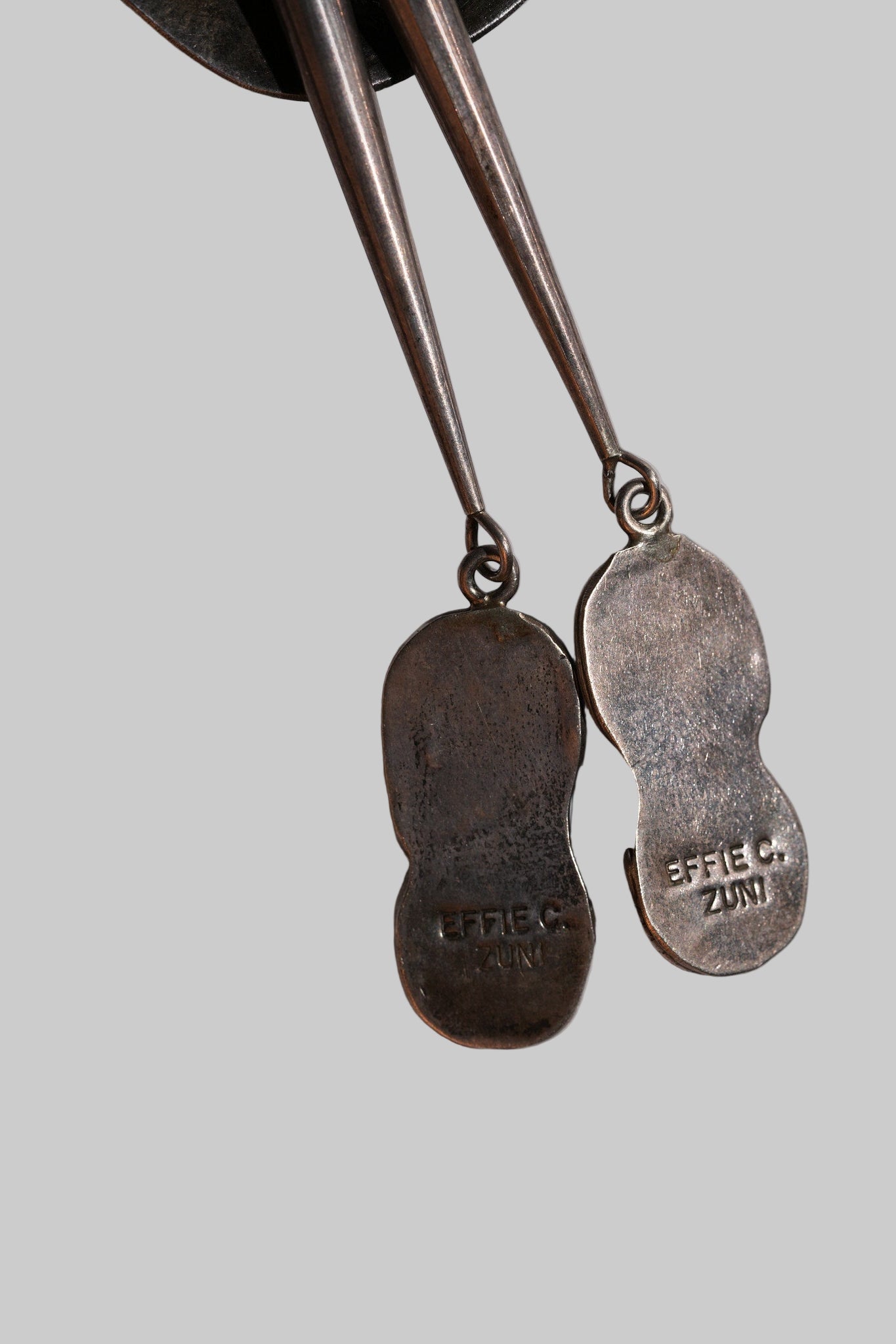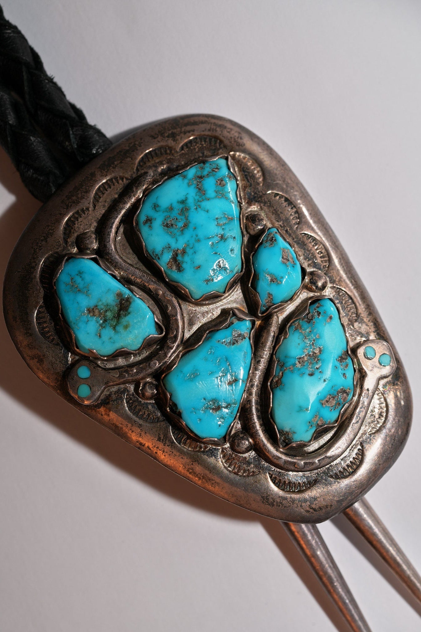Very traditional bolo from the Zuni's, Effie Calavaza's turquoise stones with winding snakes and gorgeous turquoise eyes in the snakes. The Zuni's saw the snakes as possible change due to the shedding of their skin and also representative of lighting and rain. Many other tribes work with snakes and they all have their meanings for them. The bolo center is appx 2 7/8" in length or appx 86mm. And the width at the widest point is appx 2" or appx 51mm. The tips with snakes are appx 1 1/2" in length or appx 38mm and the width is appx 1/4" or appx 6mm. The entire bolo length with the deerskin braided rope is appx 41" or appx 1041mm. Included in that measurement is the full sterling tip with the snakes of 3 1/2"or 89mm. Heavy weighing in at appx 91grams. Pre owned in good condition.