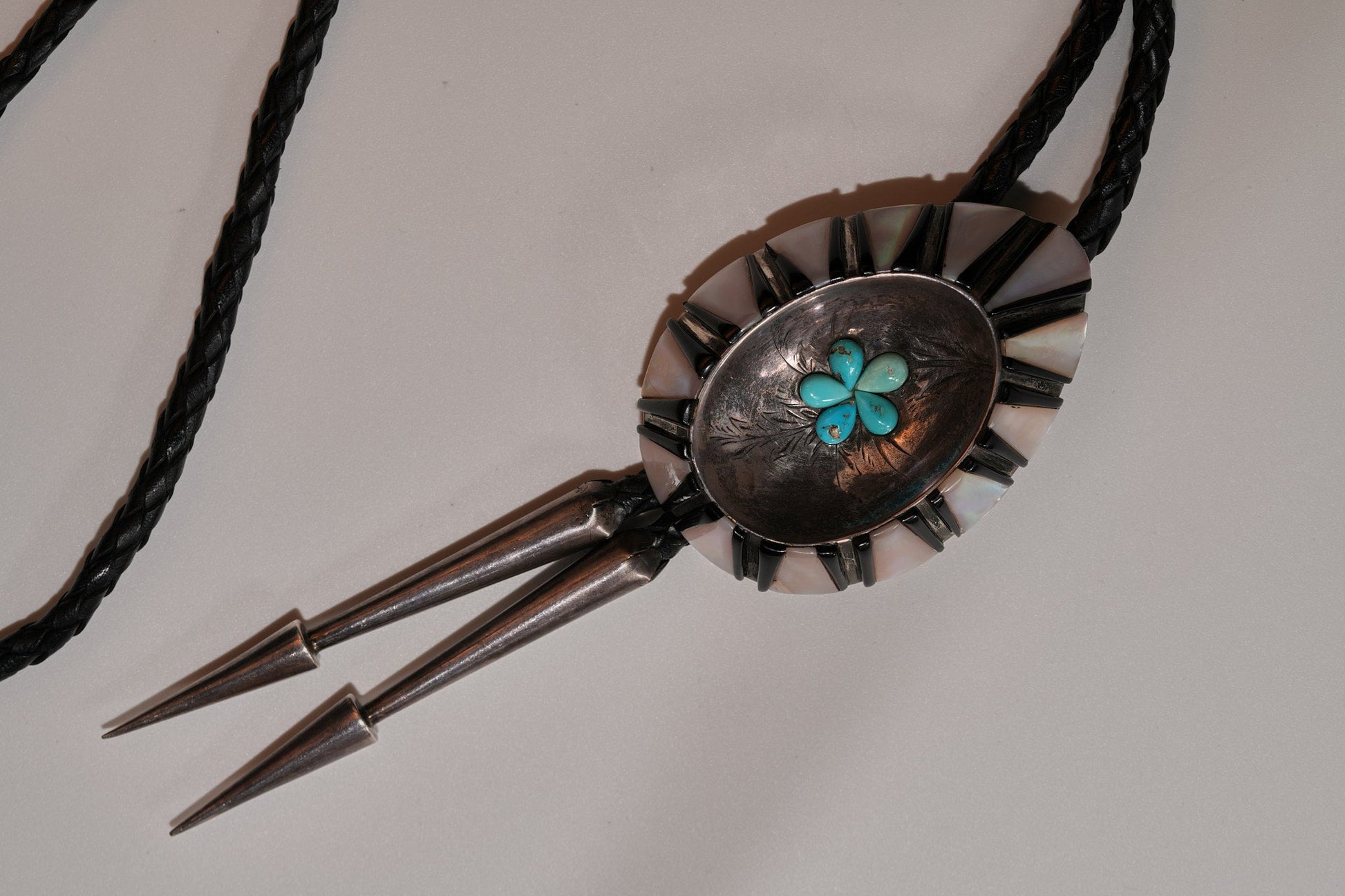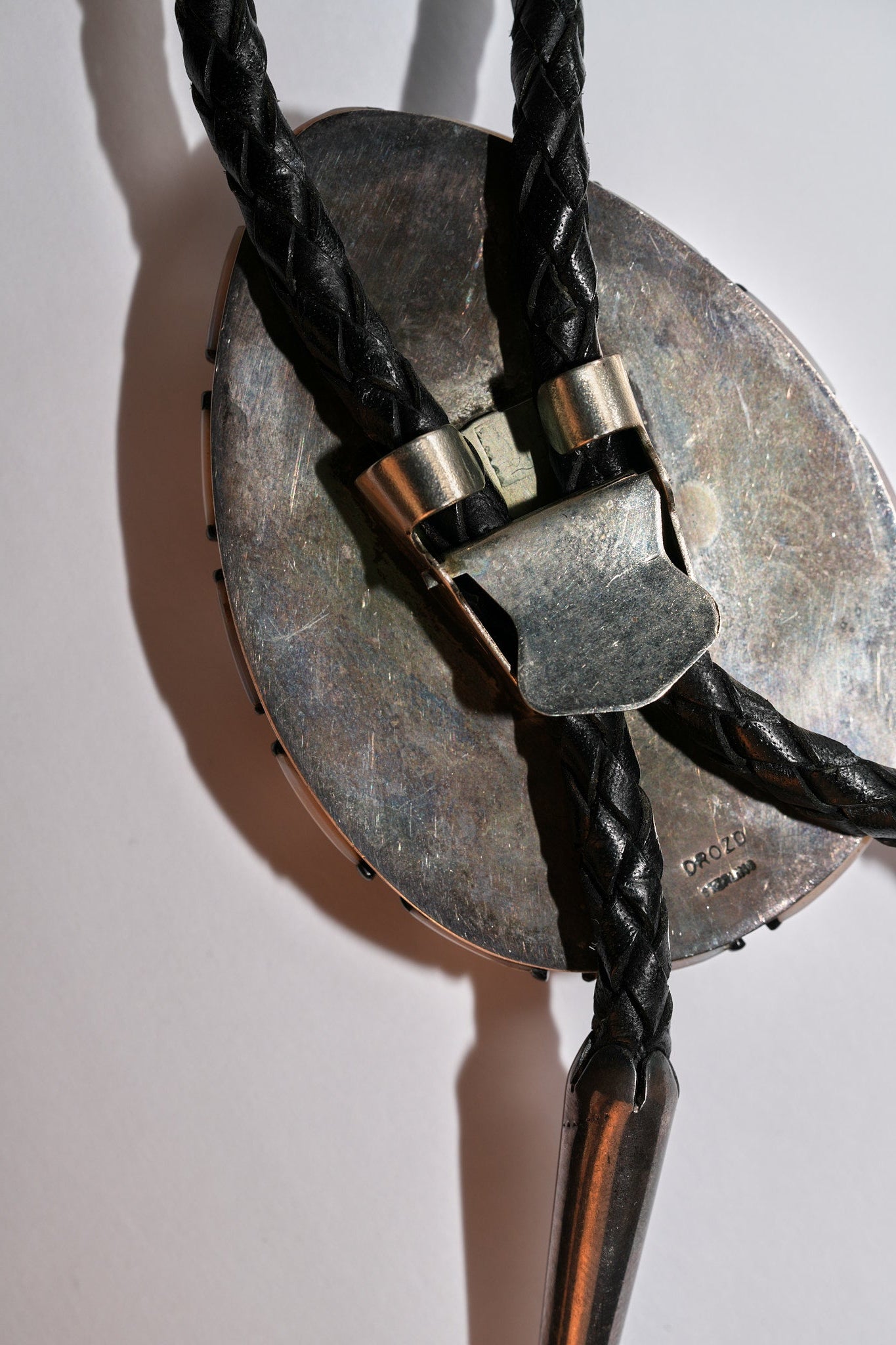 This bolo is NOT NATIVE AMERICAN MADE, however included on the bolo page, as it is indeed a good looking bolo. Sort of art deco with sterling silver engraved, turquoise, black jet and mother of pearl for the centerpiece. Bolo is appx 39 1/2" in length or 1003 mm including the sterling tips which are a little over appx 3" each or 76mm. The centerpiece is appx 2 7/8" or appx 71mm in length and the widest point of the piece is appx 2" or 51mm. The bolo looks stunning or black, and probably anything else you want to wear providing it is a solid. Drozd is the hallmark. Robert Drozd is a notable artist and designer known for his jewelry, particularly pieces in a Southwestern style that incorporate sterling silver, turquoise, coral, onyx, and dichroic glass. Pre owned in good condition.