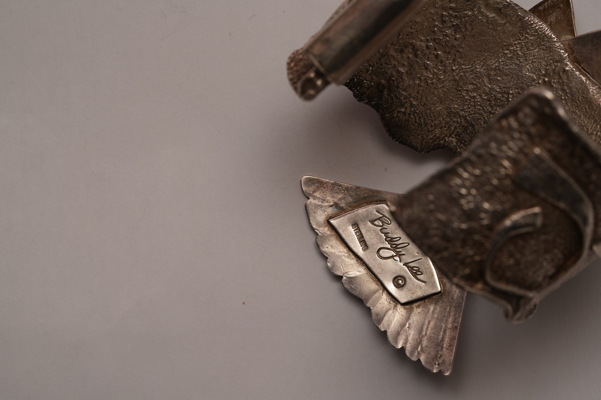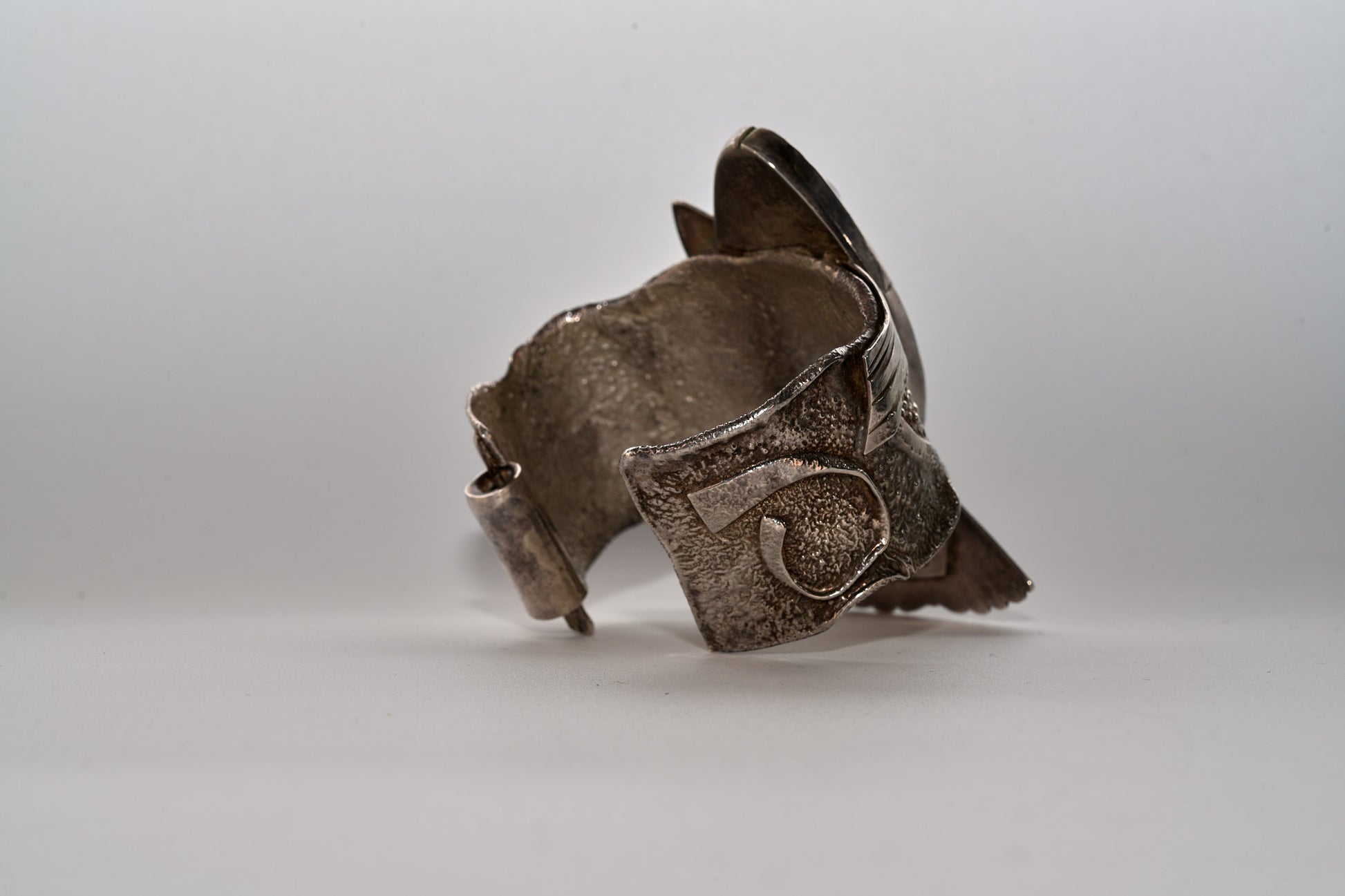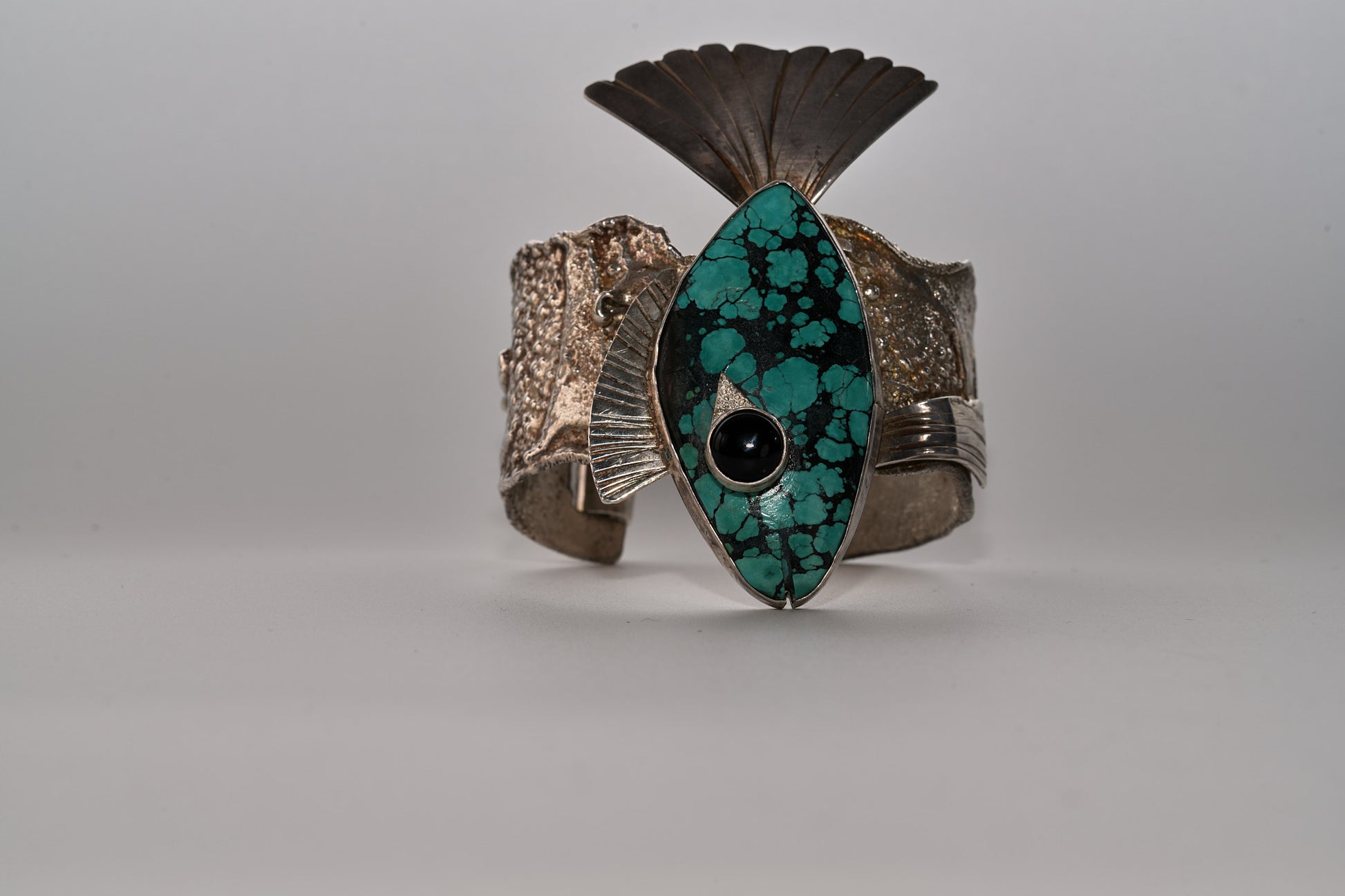 Large sterling silver and Chinese turquoise cuff bracelet. Uniquely made for easy on and off the arm. Please note the pictures. Made by Buddy Lee, who lived and produced work in Santa Fe, NM. He loved Picasso and the influence is noticeable in his jewelry. Deceased. Weighs 108 grams and fits up to a 7 -7.5 wrist or appx 191mm. Easy to wear. Pre owned in great condition. Perfect for over the long sleeve sweater. Buddy Lee is not native.