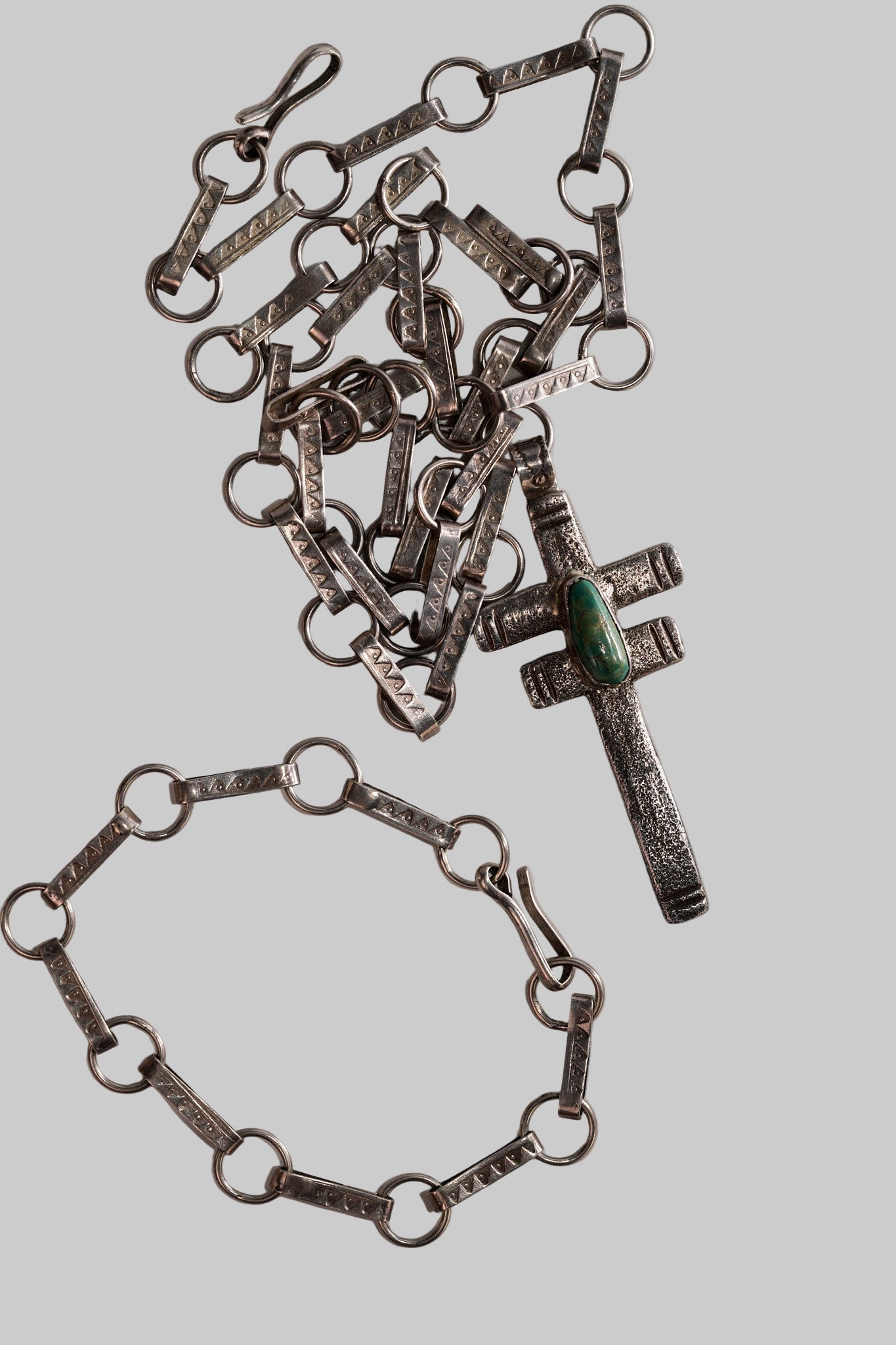 Sterling silver handmade chain by Orland Crespin, and matching bracelet. I believe someone from Leo Coriz's family made the tufa cast cross with Carico Lake turquoise. Still working on the history. Hallmarked for Crespin and the cross is believed Coriz as told to me by Anthony Lovato grandson of Leo. 2 great pieces by two masters. The neckchain is appx 29" or appx 737mm and the double bar cross is appx 3" or appx 76mm long by 1 1/4" or appx 32mm wide. The turquoise stone which is all natural is about 1/2" long or 13mm. Fully hallmarked, The matching bracelet is is appx 9" or appx 229mm and will fit up to an 8 1/2 wrist. You can wear the bracelet attached to the chain for extra length. In good condition and pre owned.