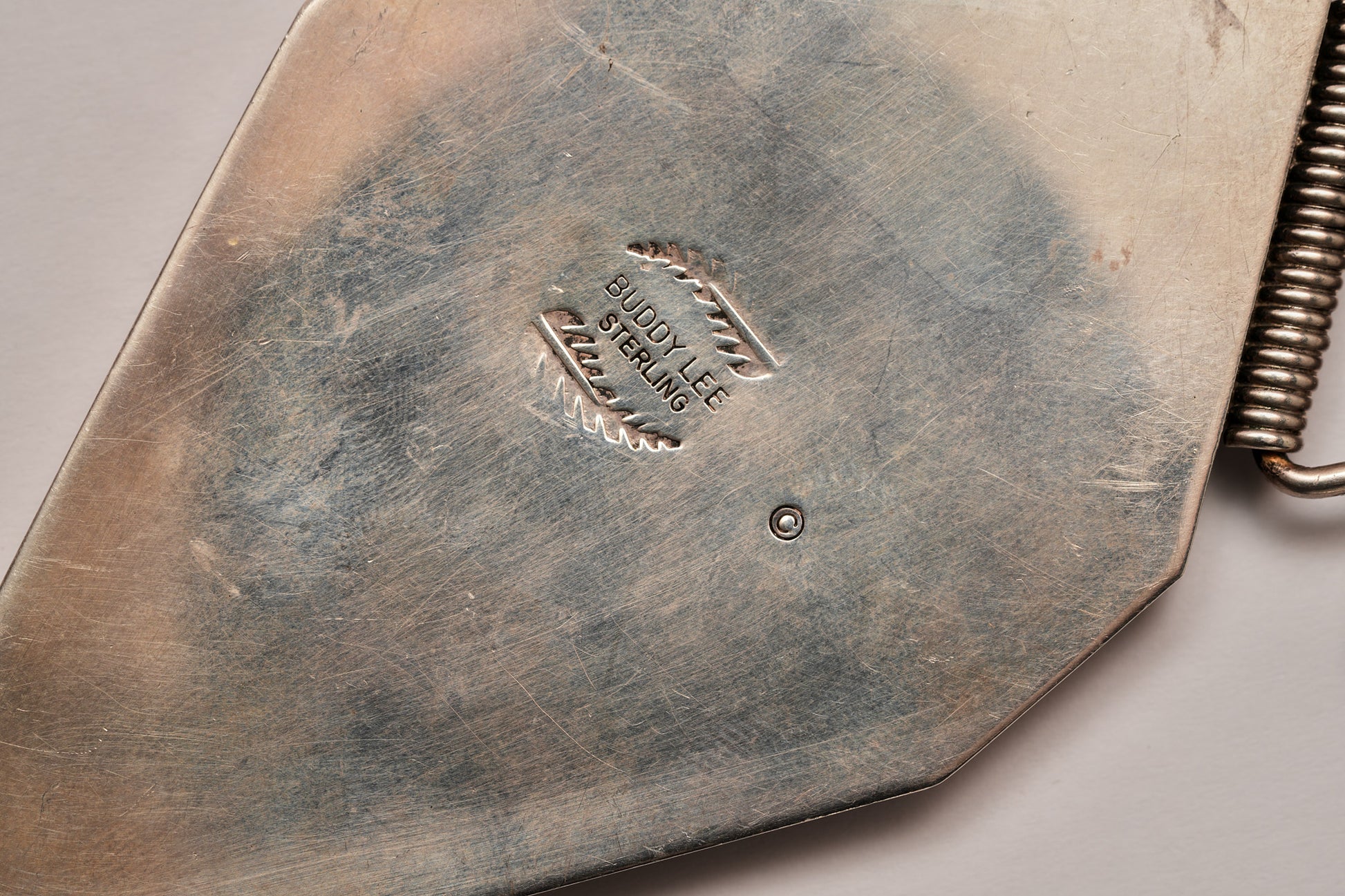 Sterling silver, sort of art deco, with centerpiece made of wood, antler, fossilized bone. Hand made by Buddy Lee. The necklace is designed for center attraction. The centerpiece is appx 5"or appx or 127mm by 2 1/2" or appx 64mm wide. The entire sterling necklace to the center piece is appx 18" to the centerpiece or appx 457 mm. Somewhat difficult to measure however on the neck it will be about 20" across or appx 508mm and then the centerpiece.This is a great look for the elegant and classic dresser, suits, simple but elegant dresses and tops. Pre owned.