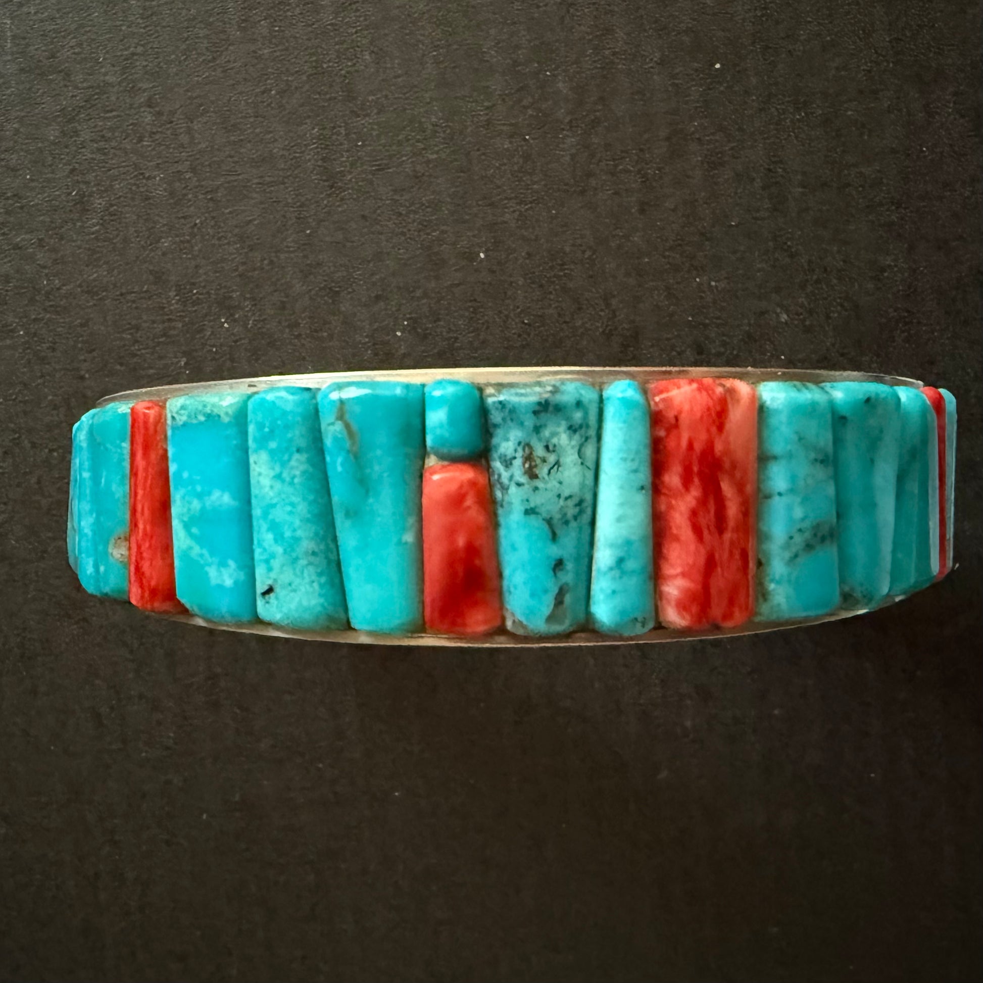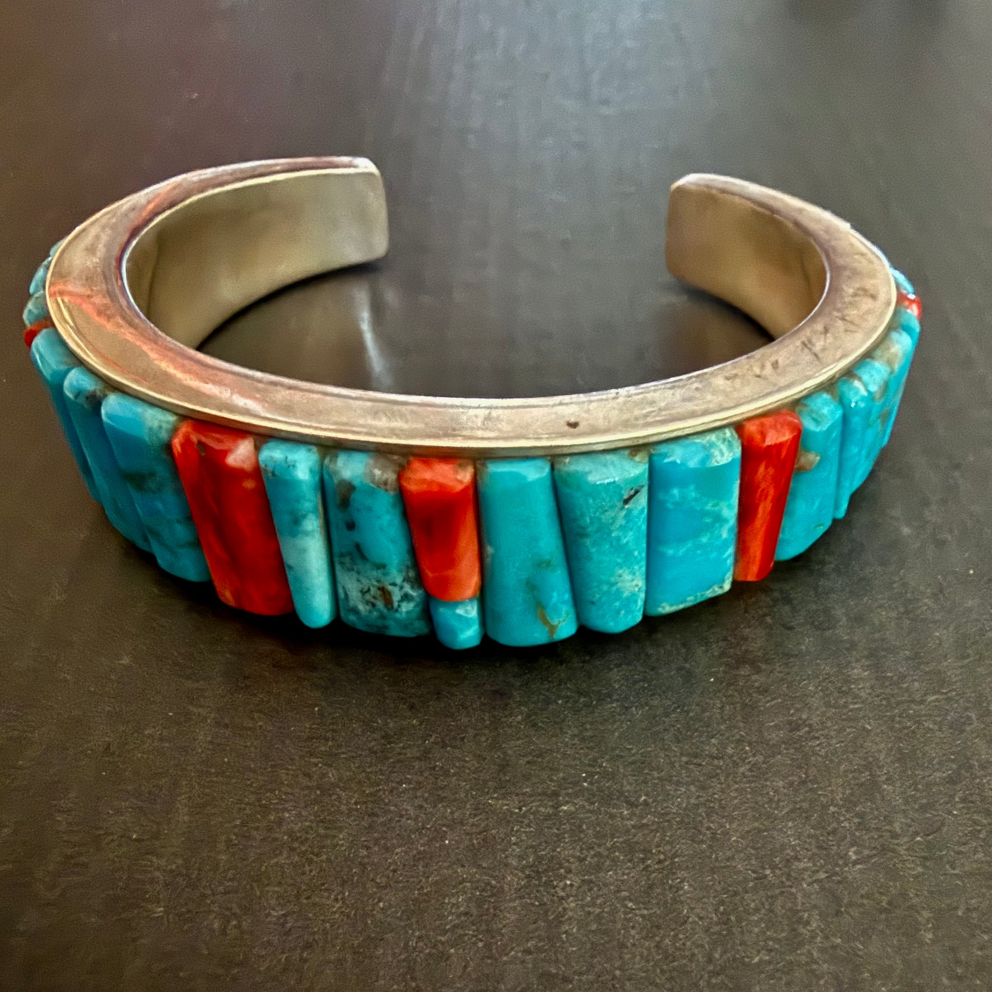 This bracelet is vibrant with the turquoise and the spiny oyster shell. Made cobblestone style, Melvin Francis, Navajo, created this cuff. Weighing in at appx 56 grams, it's sturdy.