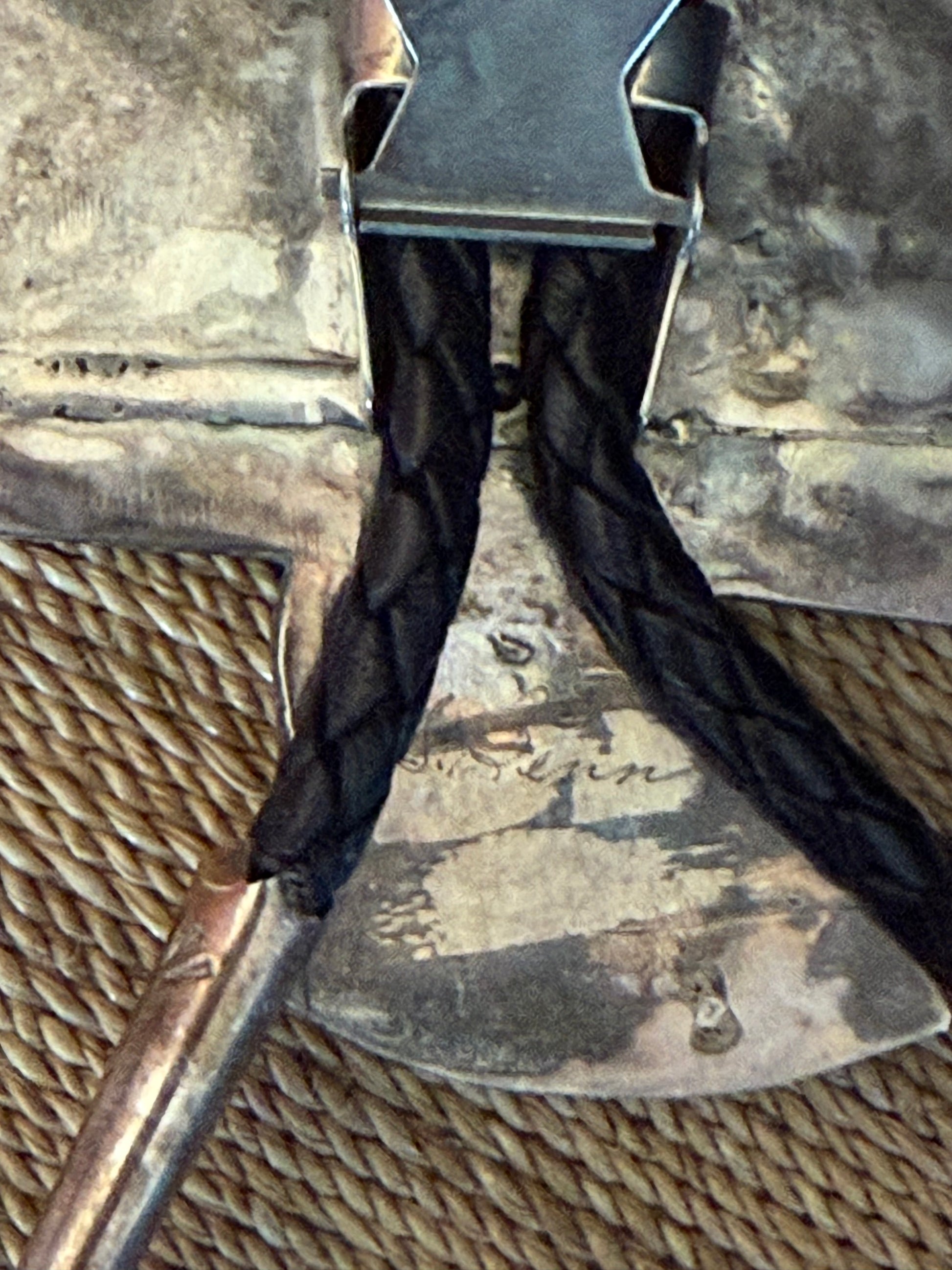 Just beautiful. Virgil and Shirley Benn artistry with their use of great stones and design. Headdress is composed of aroma jet, turquoise, yellow lip mother of pearl, shell, coral and mother of pearl. The width of the bolo is appx 3" or 76.2mm and the length is another 3" or 76.2mm. Traditional bolo tips sterling silver. I don't know the date of this piece. Fully hallmarked on the back, however difficult to see with age of the silver. And you know that is patina, and in most cases do not recommend polishing as the value decreases. Just amazing. Bolo tie measures 50" total. (One photo shows more light on the bolo).