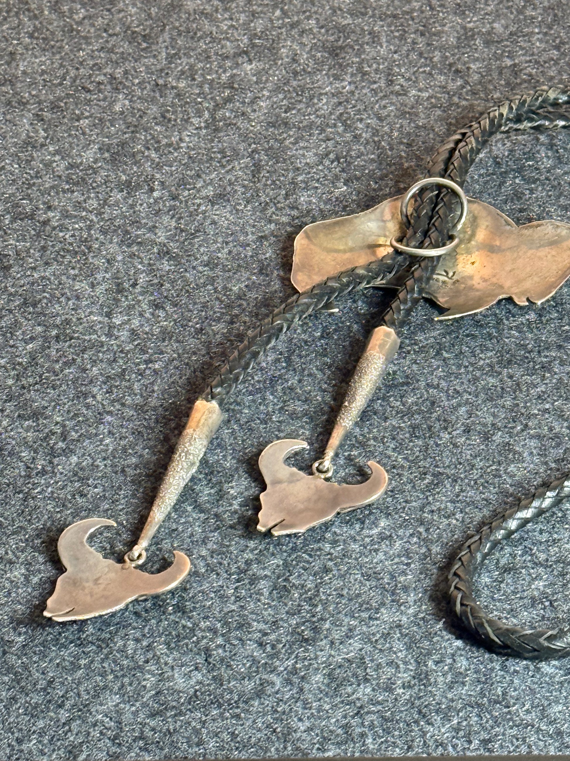 Sterling silver, buffalo measures appx 3 1/2" across and appx 2" in height at the tallest part. Tips are appx 3 1/2" long from top to the bottom of skull. Fully hallmarked and sterling silver (not marked). Pre owned in very good condition. The leather tie has seen some wear and can easily be replaced.